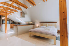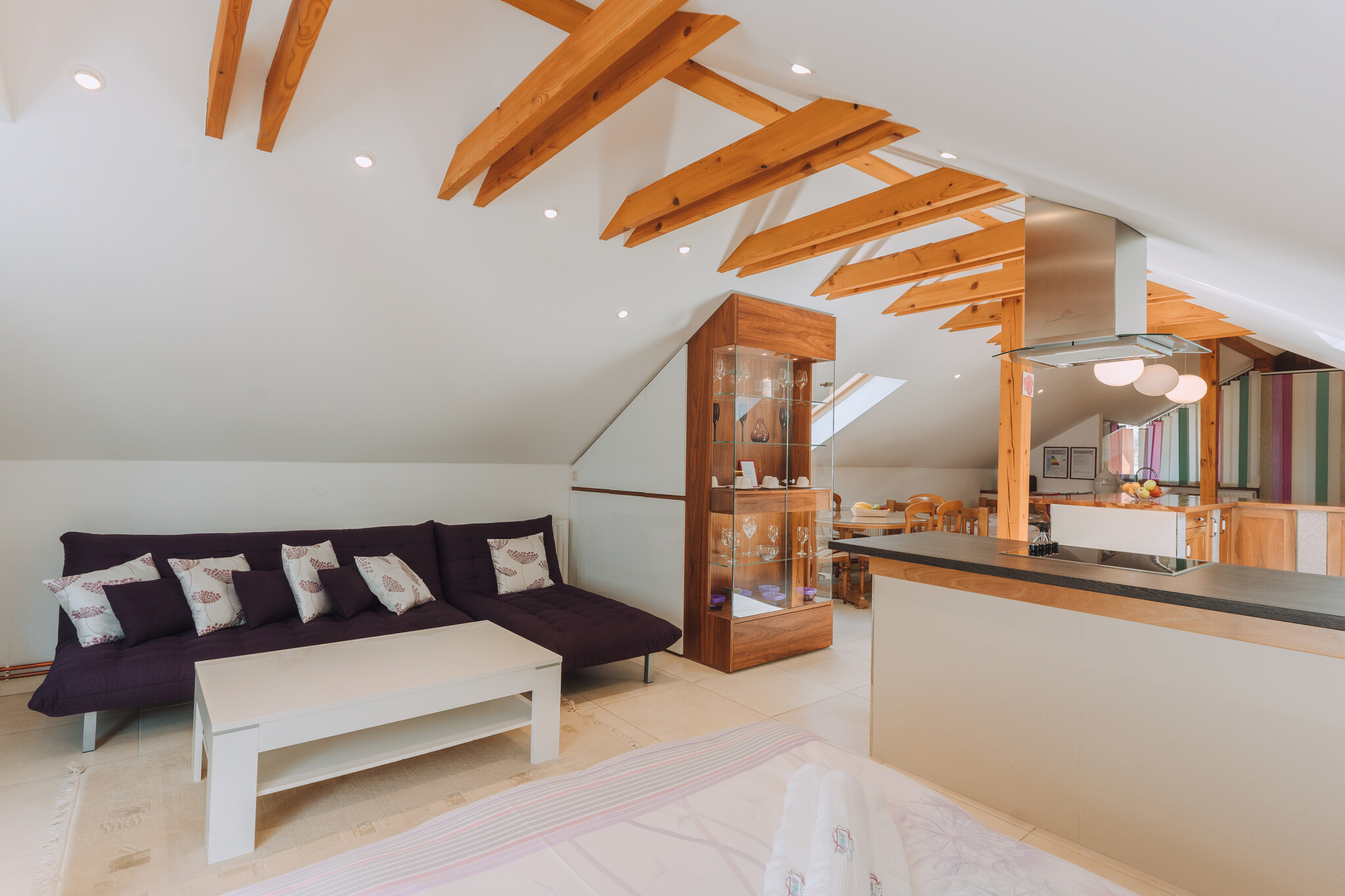 Nalazi se u potkrovlju objekta na površini od cca 100 m². U sklopu njega je velika kompletno opremljena kuhinja, stol za blagovanje, ormar, perilica rublja, francuski ležaj 180 x 200 cm) i jedan zasebni krevet (100 x 210). Ima kompletno opremljene dvije kupaonice. Ima klima uređaj te grijanje na plin ili drva koje je gostima na raspolaganju prema želji i sklonostima. Na ulazu u studio apartman (istočna strana) nalazi se velika terasa s pogledom na voćnjak, park, vrt i šumu.